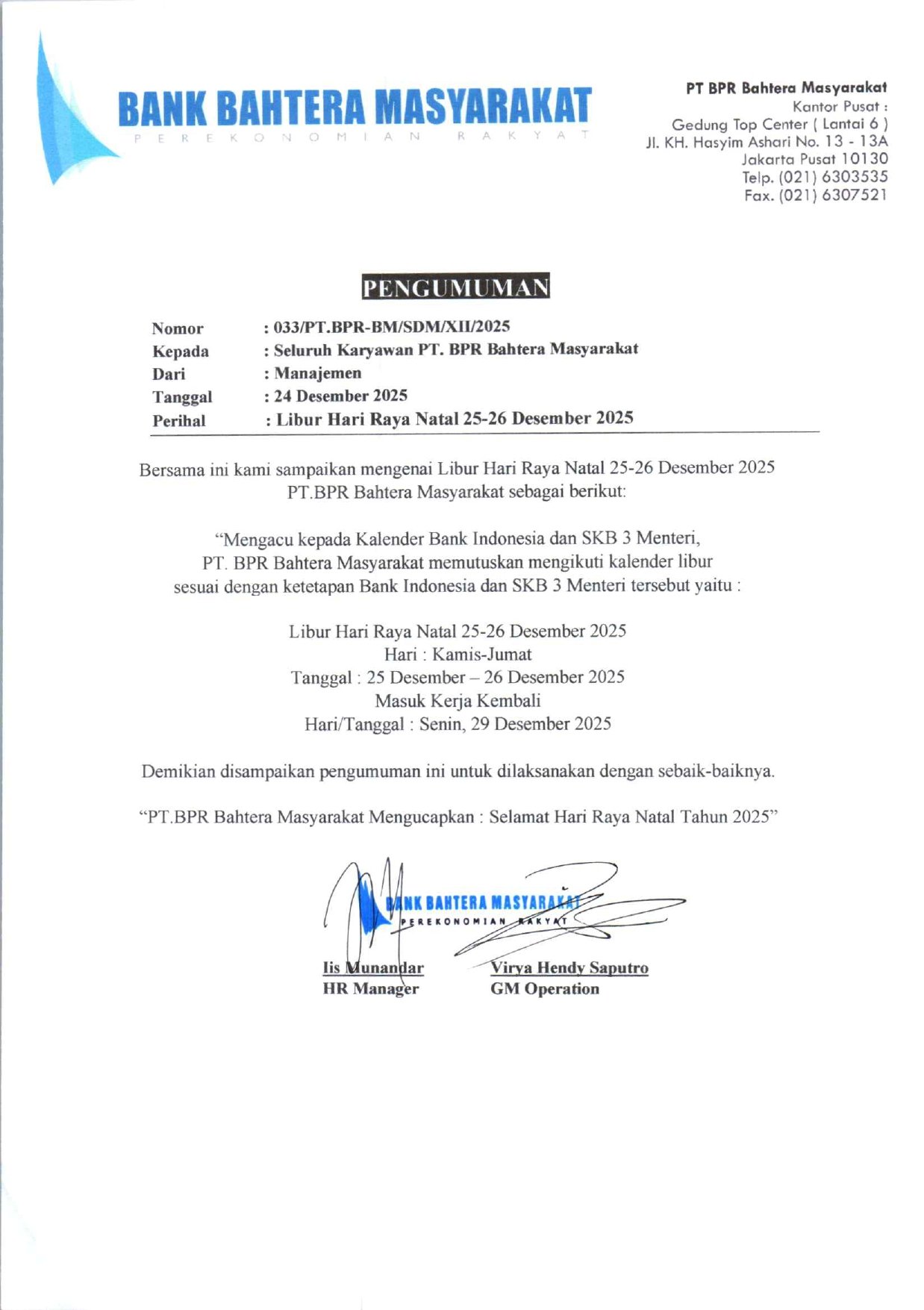 Bersama ini kami sampaikan mengenai Libur Hari Raya Natal 2025